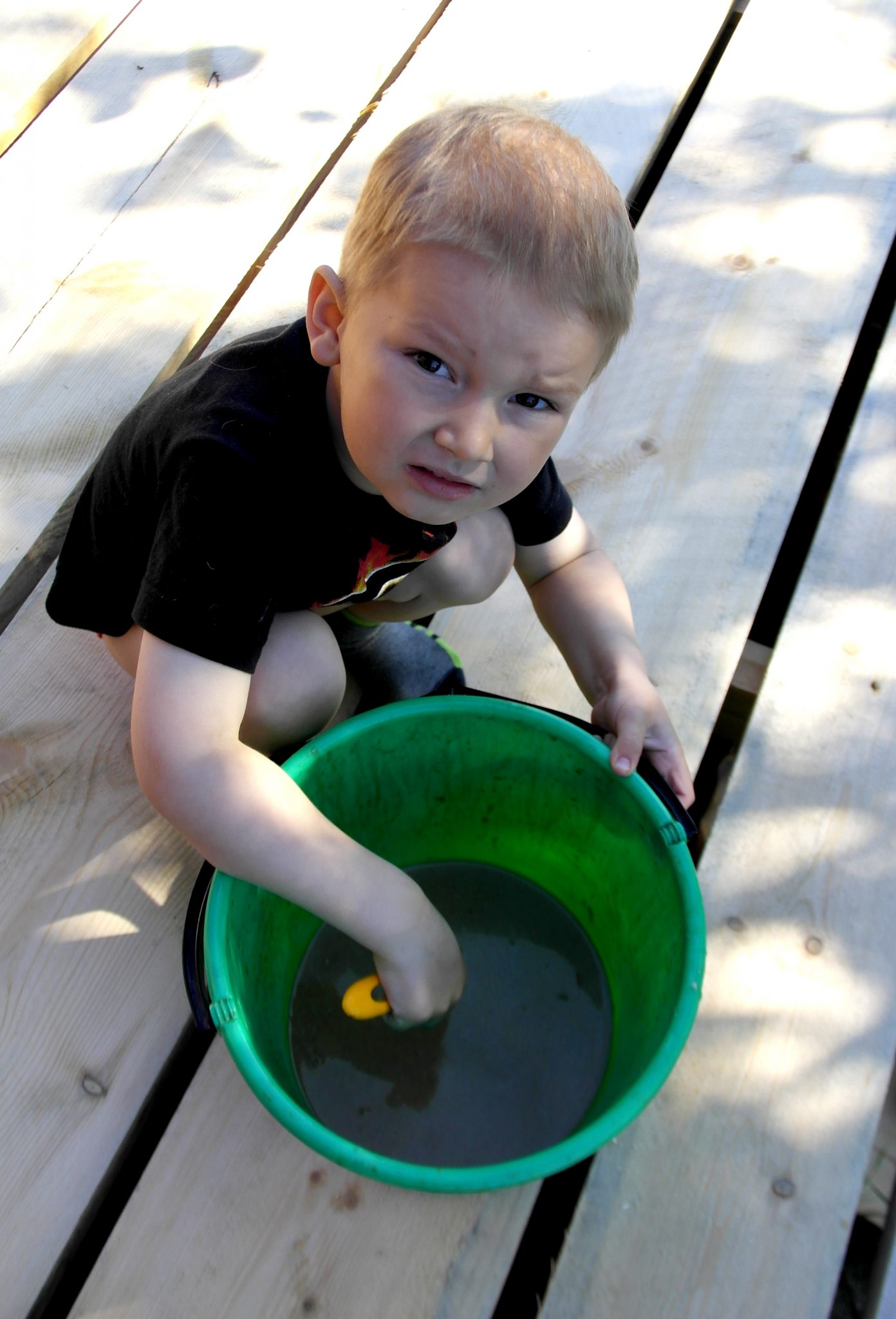 Dante knäcker ägg till linoljeemulsion som vi ska behandla morsfarsans stora altan med.